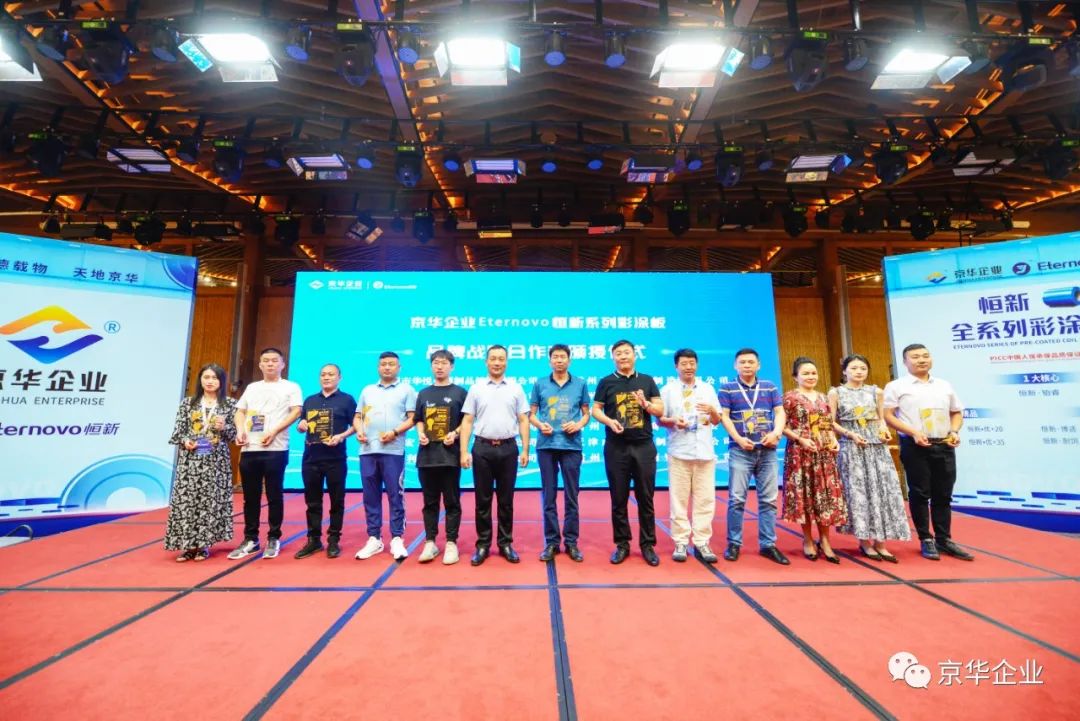 在現(xiàn)場300多位嘉賓的共同見證下,“恒新”品牌系列彩涂產(chǎn)品的經(jīng)銷商頒授儀式隆重舉行,京華企業(yè)總經(jīng)理陳鐵柱先生向聯(lián)合主辦會議的京津冀地區(qū)十二家經(jīng)銷商代表頒發(fā)了恒新品牌“合作共贏、共創(chuàng)未來”的授權(quán)牌,感謝大家長期以來與公司戮力同心,持續(xù)提升著京華彩涂板在京津冀地區(qū)的行業(yè)標(biāo)桿形象。 京華企業(yè)與廣大客戶攜手共進(jìn),實現(xiàn)共贏共生,不斷創(chuàng)新與超越,努力鑄就綠色建材實力領(lǐng)先品牌,打造屬于整個金屬涂鍍行業(yè)的美好明天!