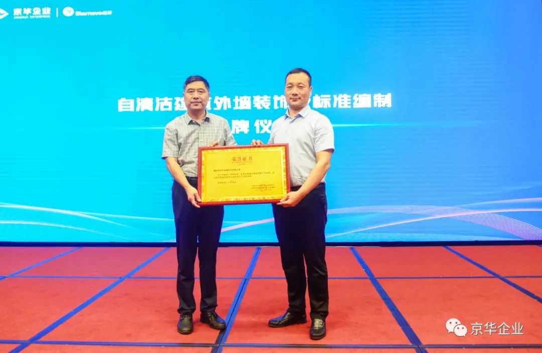 來自中國建材規(guī)劃院應(yīng)用技術(shù)開發(fā)研究院/中關(guān)村人居環(huán)境工程與材料研究院副院長王忠勇先生就綠色建筑及綠色建材課題向現(xiàn)場嘉賓進(jìn)行了分享,并向京華企業(yè)授予 “自清潔建筑外墻裝飾板標(biāo)準(zhǔn)編制” 榮譽(yù)牌,對京華企業(yè)參與建筑板材生產(chǎn)標(biāo)準(zhǔn)編制表示鼓勵與肯定。